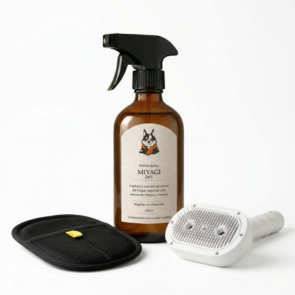 El Kit Hogar en Calma reemplaza la limpieza constante por un ritual de 3 pasos que cuida el pelaje de tu mascota, limpia tus superficies y refresca el ambiente.